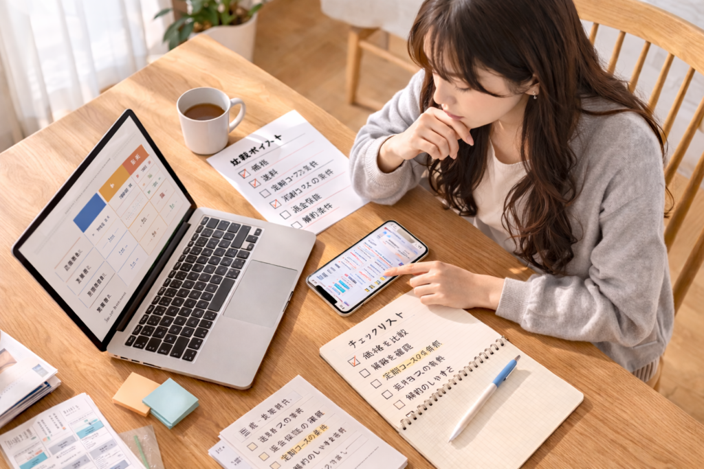 ここで大切なのは、価格だけでなく、販売元、保証の対象範囲、解約のしやすさなど、比較項目をそろえることです。